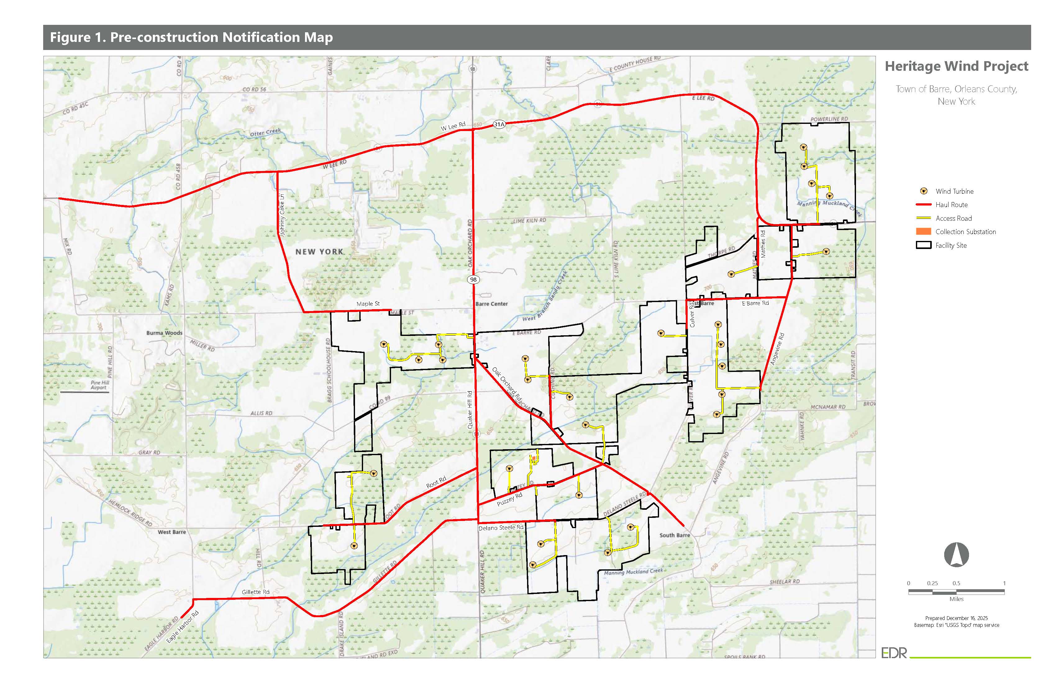 Heritage Wind will construct the Facility in the Town of Barre, Orleans County. When completed, the Facility will consist of up to 28 turbines with a total generating capacity of up to 126 megawatts (MW). Other proposed components to be constructed in later phases of the Project will include: